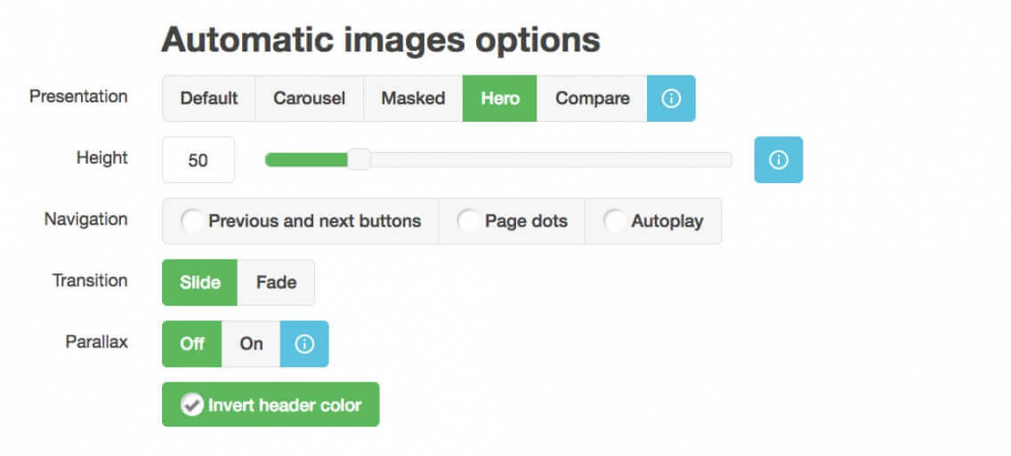 By selecting hero in automatic presentation options the images will appear next to each other in a masked frame. By default the height of the hero is 50% of the view height. Because they appear even under the header of the webpage there is an invert header option because most images are slightly darker.